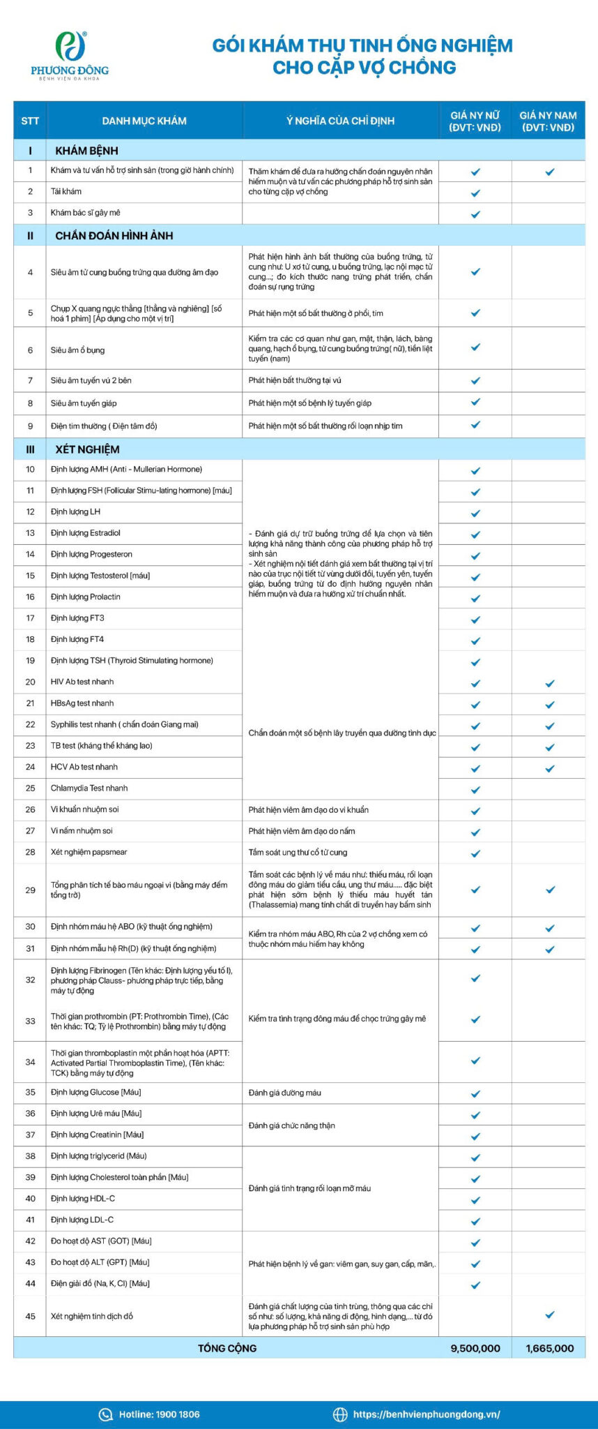 Gói khám thụ tinh ống nghiệm cho cặp vợ chồng gồm 47 danh mục, trong đó: